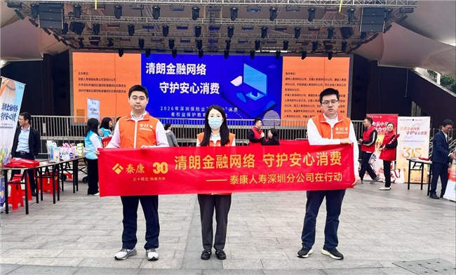 3月10日下午,在2026年“3·15”金融消费者权益保护教育宣传活动期间,泰康人寿与泰康养老深圳分公司携手参与由深圳寿险同业消保活动联盟组织开展的金融知识进社区集中宣传活动,在福田区环庆文化广场设立宣传展位,通过“折页讲解+线上阅读”相结合的方式,为社区居民普及金融消费者权益保护知识,帮助市民提升风险防范意识,守护安心消费环境。
